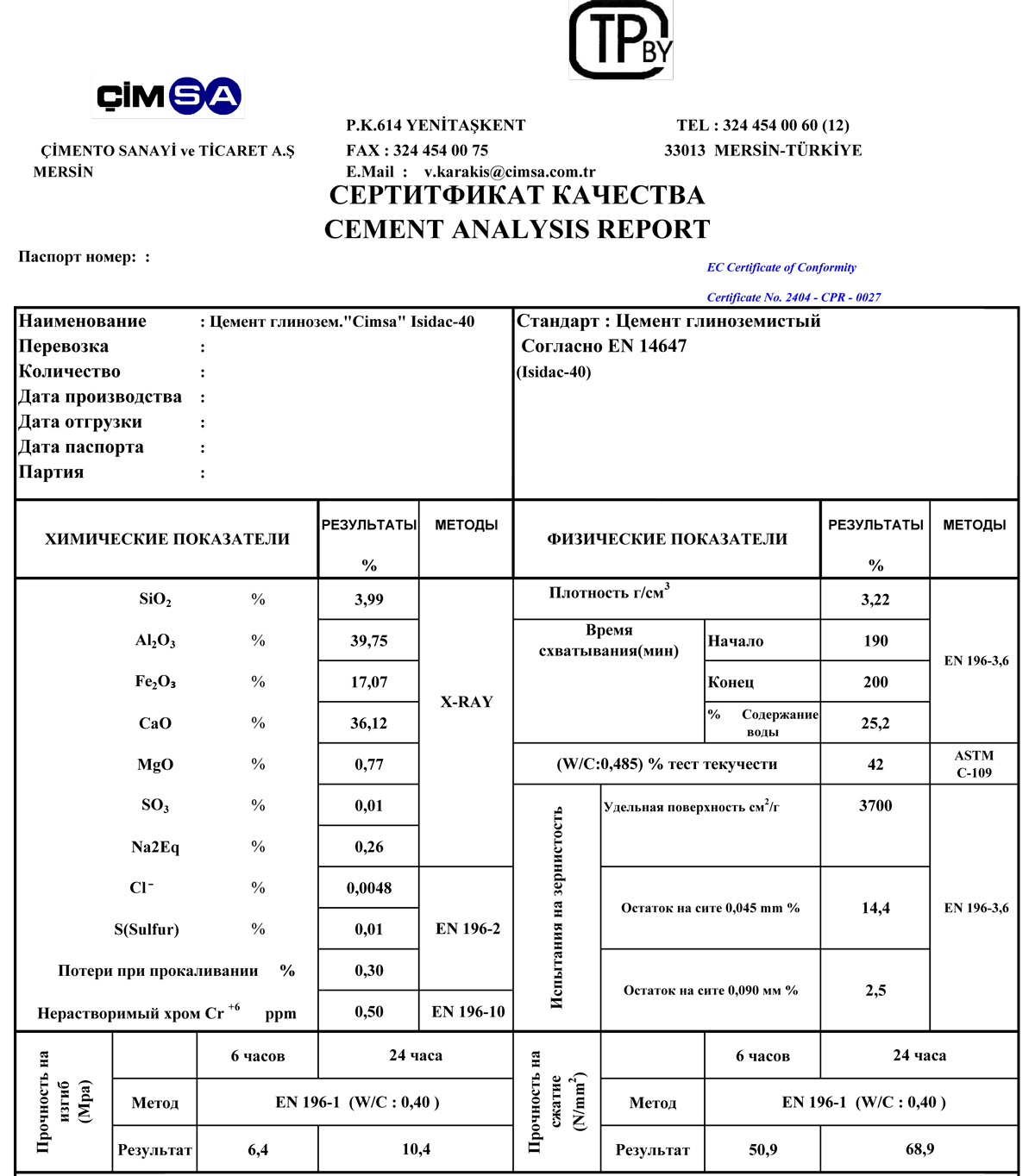 Глиноземистый (кальций-алюминатный) цемент “CIMSA” Isidac-40